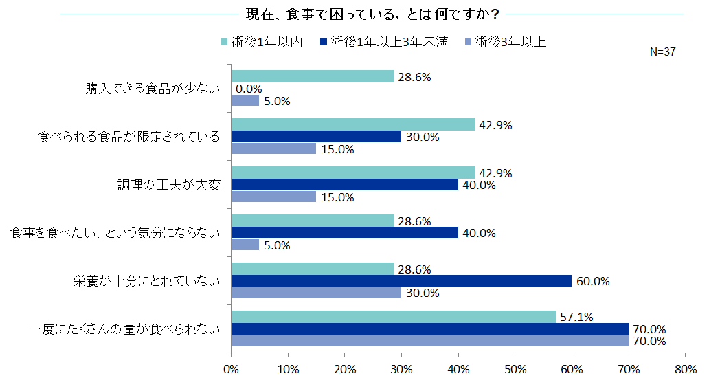 2021年3月に当アルファ・クラブの会員に実施した、食事に関するアンケート結果を紹介します。手術後期間別に比較すると、手術後間もない期間は購入できる市販品が少ないことや、食品選択の不自由であることに悩んでいる方が多い傾向にありました。一方、ある程度年数が経過すると、食欲の低下や栄養不足、一回の食事量が少ないことに悩みを抱えておられることから、医療従事者には術後障害に対するリハビリ指導も実施して頂きたいと考えております。