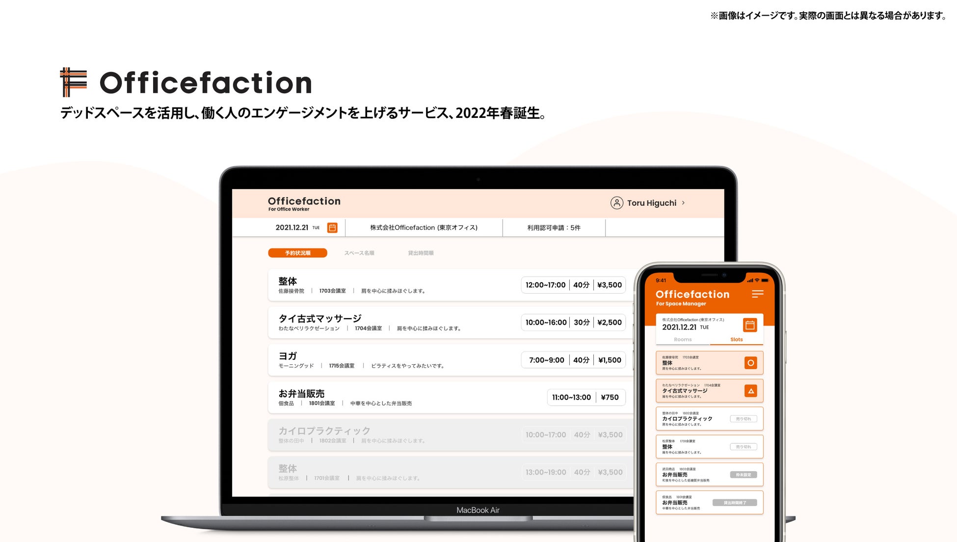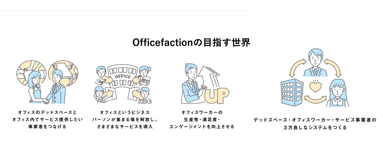 今回、調達した資金を用いて採用やプロダクトの開発を進めております。Officefactionではコロナ禍でのテレワーク推進で新たに発生したオフィスのデッドスペースと、そこでサービスを提供したい事業者(マッサージセラピストやヨガ講師、英会話講師、ランチボックスなど)をつなげて、デッドスペース、オフィスワーカー、サービス事業者の3方良しな世界観を実現すべく、プラットフォームを開発中です。
