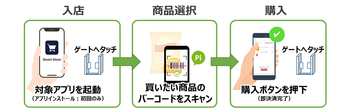 スマートフォンのアプリにより、入店から商品選択、決済までをお客様ご自身で完結することで、レジ待ちをなくし、密接・密集を避けた非接触の購買を実現します。