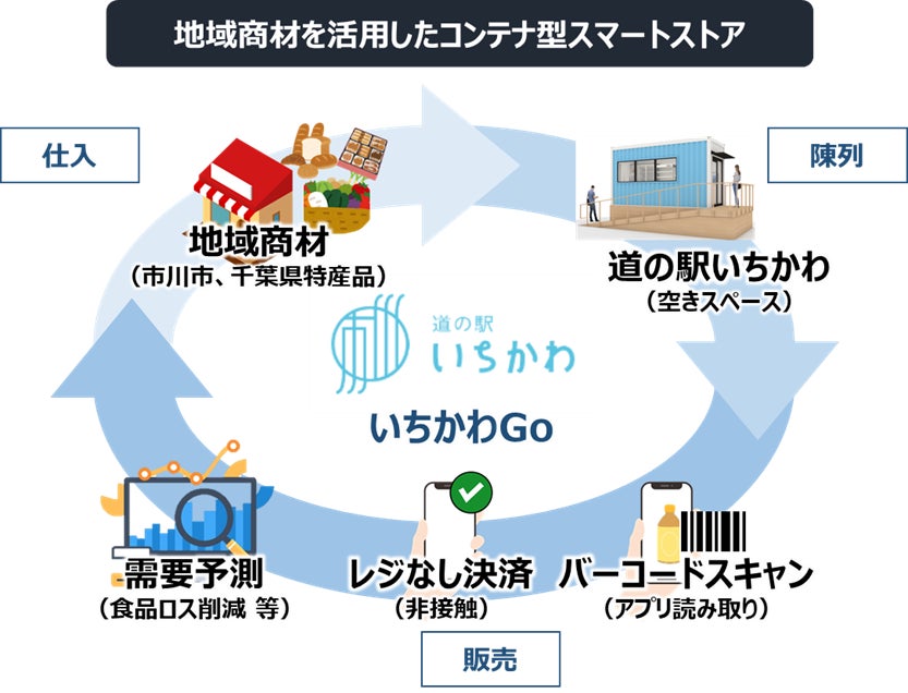 この度、日本メックス、ピースノート、NTT東日本では、このような環境の変化を踏まえ、「道の駅いちかわ」における更なる利便性向上と効率的な店舗運営に向け、環境に配慮した「コンテナ型」による無人でも運営可能な地域密着型のスマートストア※2として、「いちかわGo」を開設し、ニューノーマルの時代に即した店舗形成を目指してまいります。