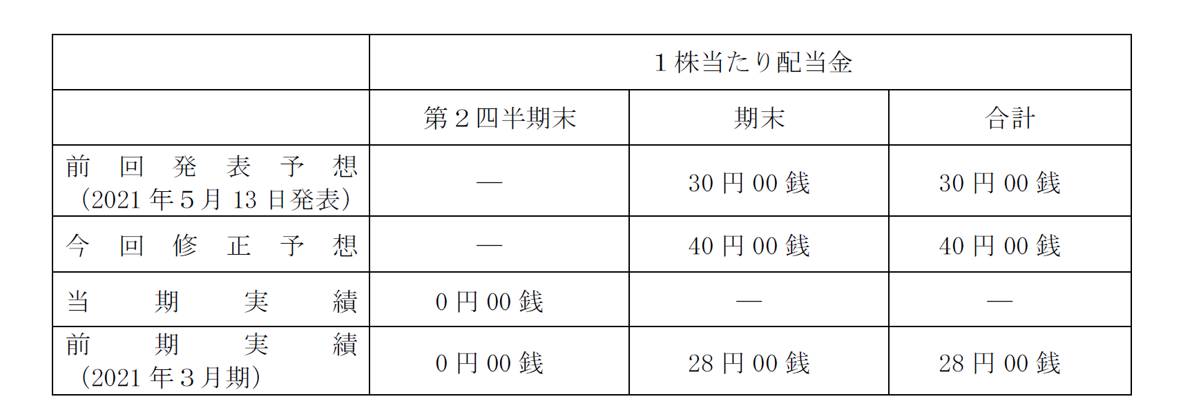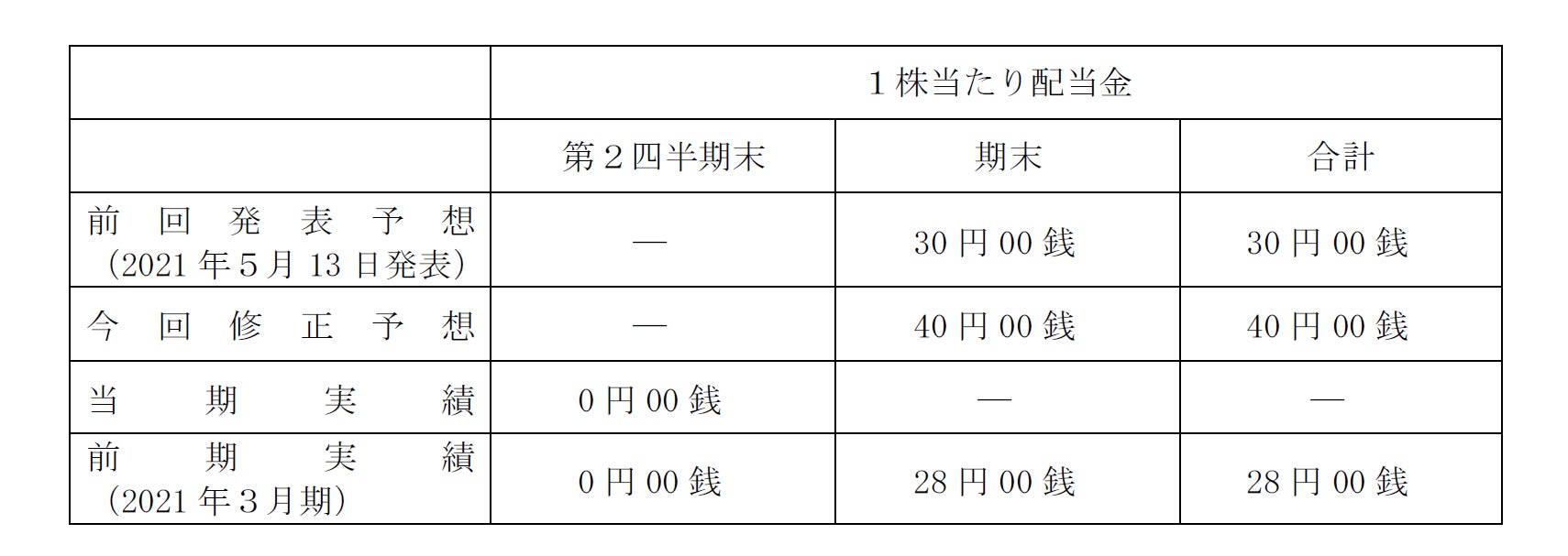 上記業績予想の上方修正に伴い、株主の皆さまに一層の利益還元を図るべく、期末の配当予想を1株につき40円に修正させて頂きます。