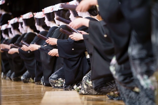 芸妓連が紫檀の拍子木を打ち、唄を歌いながら登場する華やかで雅やかな格調高い伝統儀式を披露。