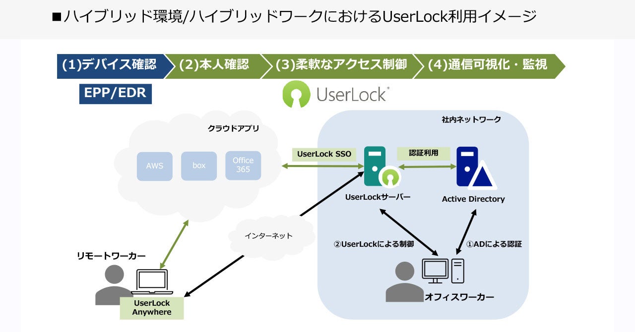 UserLock11.1では前バージョンにおいてベータ版という位置付で提供されていたUserLock SSO(シングル・サイン・オン)およびテレワーク時など社内ネットワークに接続していない状態でも各種ログイン制限を有効化するUserLock Anywhereが正式サポートされ、ハイブリッド環境・ハイブリッドワークなど、これまで以上に幅広い用途でご利用いただけるようになりました。