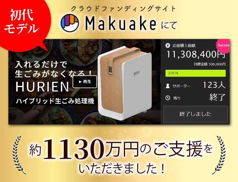 初代モデルのHURIENは、Makuakeにて1,130万円の応援購入をいただきました。新型HURIENは、物価高騰の中価格のディスカウントに成功。処理機能・消臭機能もアップデートして登場いたします。