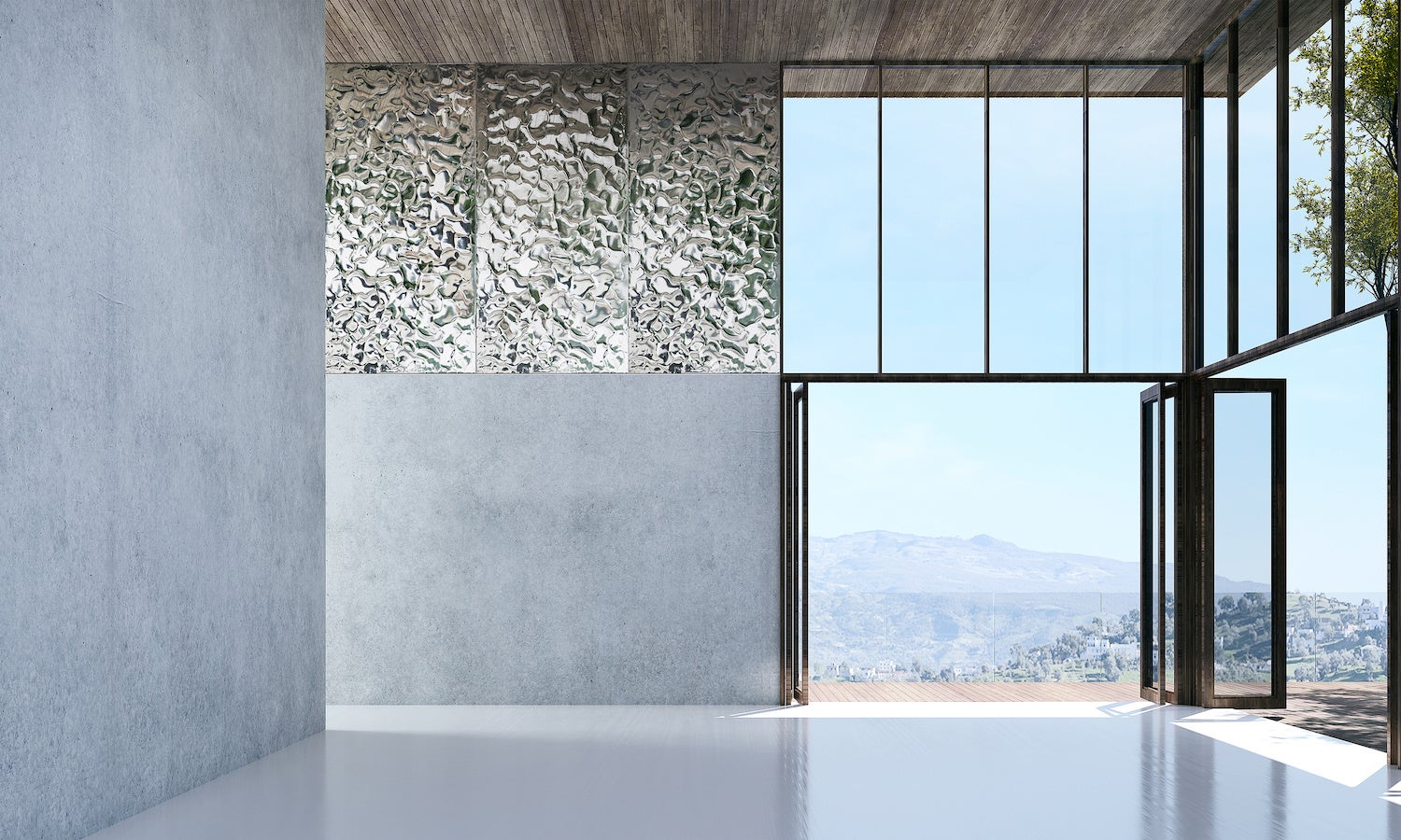 従来は、水面のような煌めきと風景を揺らめき映し出す建築パネルとしてステンレス製の商品を「ミステリアスステンレスミラー シリーズ」として、“リップルス”、“ジュ・ドー”、“水明”と商品化してきました。 主に、内装の天井材や壁面材、アートワークとして使用されてきましたが、海際などの塩害腐食地域での屋外使用が困難であり、該当地域への提供が難しい状況でした。