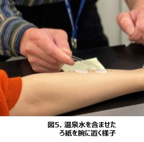 41℃の温泉水または精製水をろ紙に含ませ、腕に10分間置いた(図5)後、角層細胞を粘着テープで採取し染色・観察しました。肌のうるおい力や保護力との関連が分かっている「角層細胞のはがれ具合・大きさ・形」をもとに温泉の作用を判定しました。