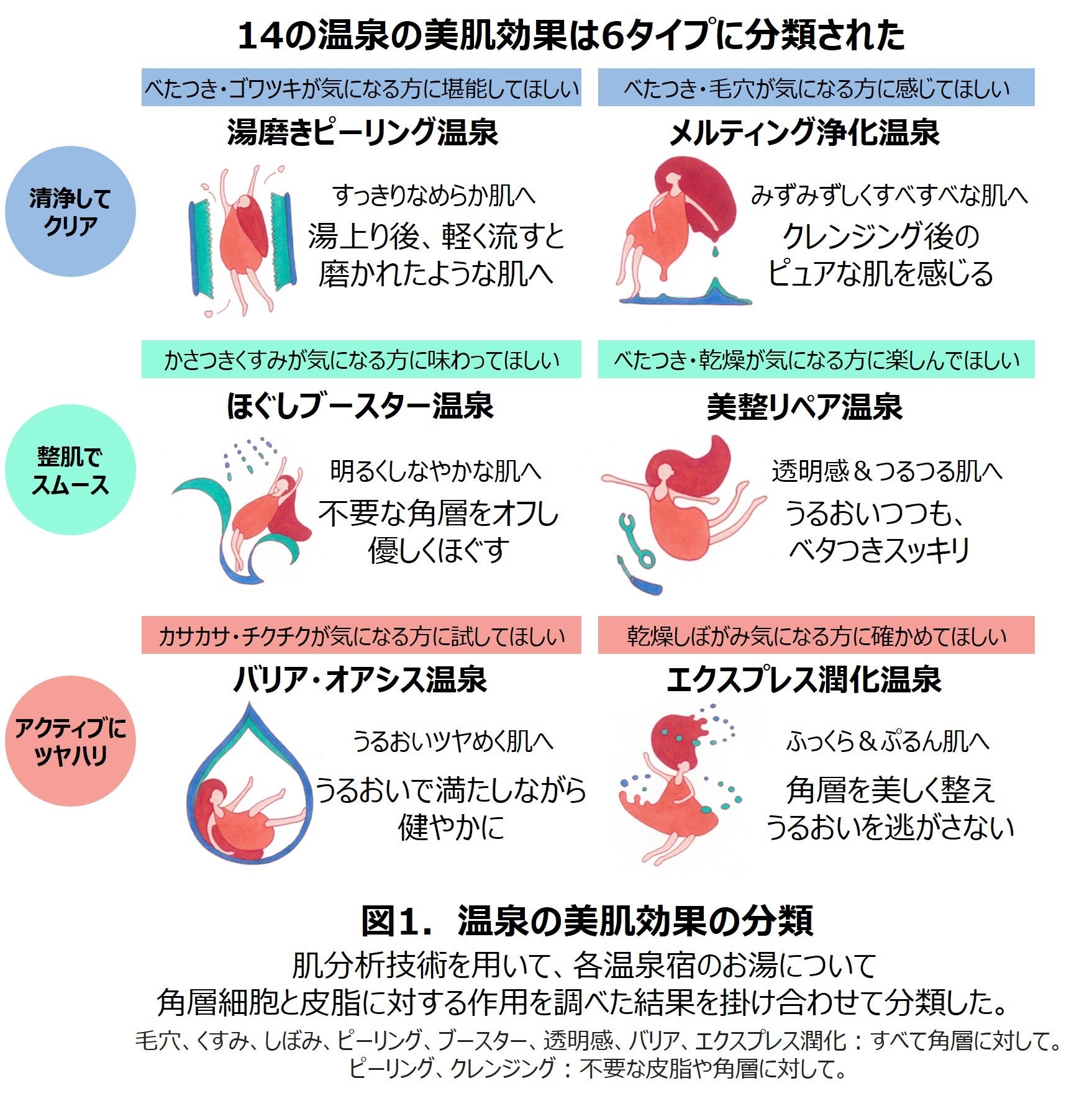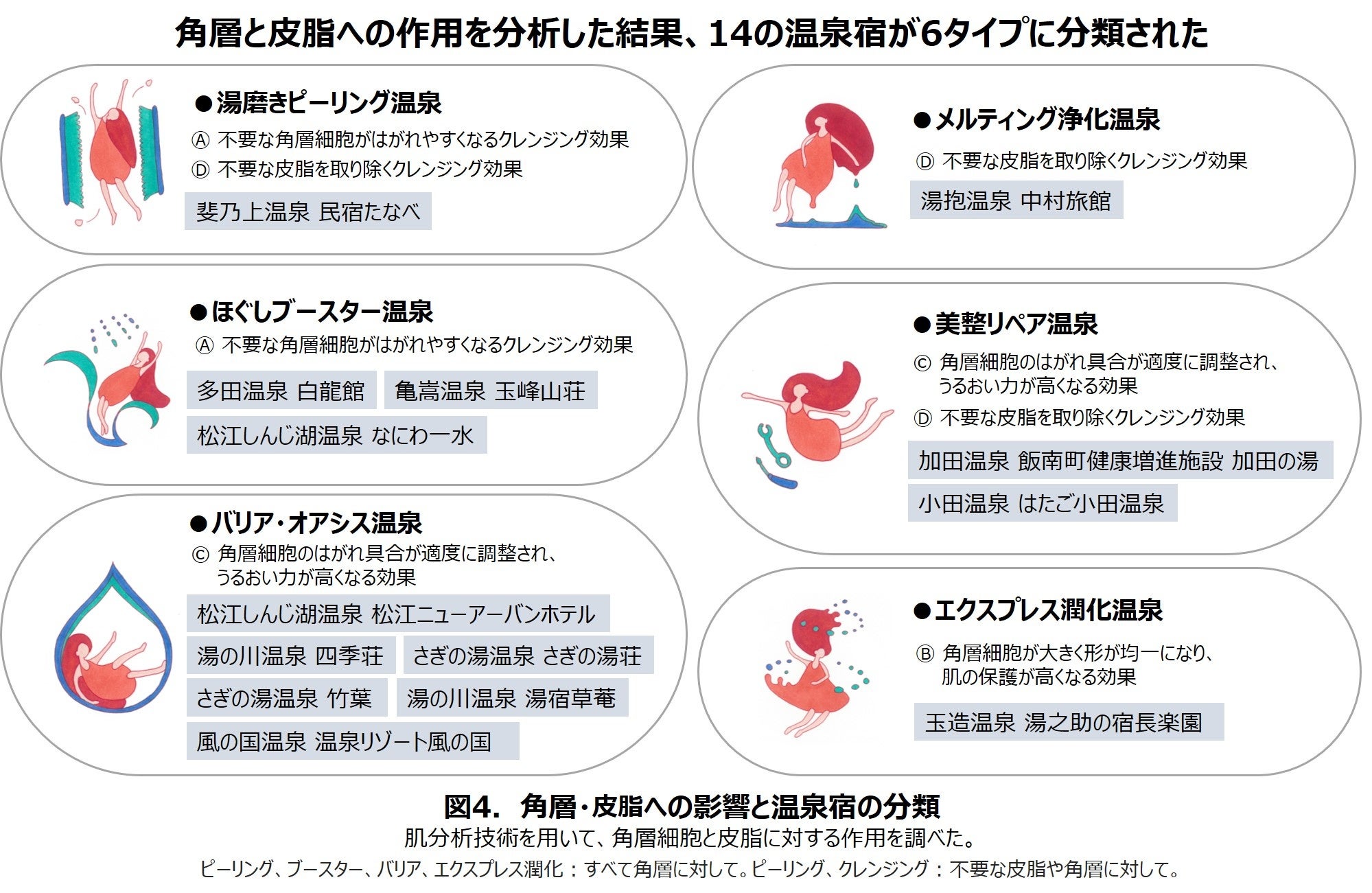 各温泉の分析結果をもとに14の温泉を作用別に分類したところ、角層細胞への作用と皮脂を取り除く作用の組み合わせにより6タイプに分類されることが分かりました(図4)。