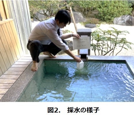 今回の分析には、源泉ではなく、実際にお客様の肌にふれる浴槽に注がれる温泉水を分析することにこだわりました(図2)。また、肌科学研究で用いられる手法を用いて体系的にスキンケア効果を調べた例は本研究が初めてです(※1)。