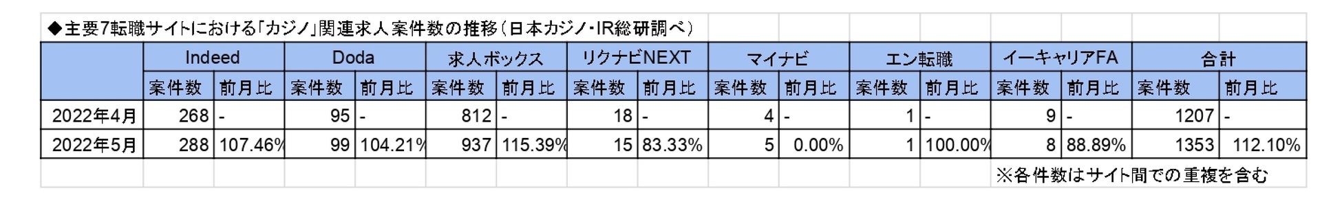 カジノIR業界専門ニュースメディア『日本カジノ・IR総研』は、主要となる7つの転職サイトにおける2022年5月時点の「カジノ」と「統合型リゾート」に関連する求人案件数をそれぞれまとめました。