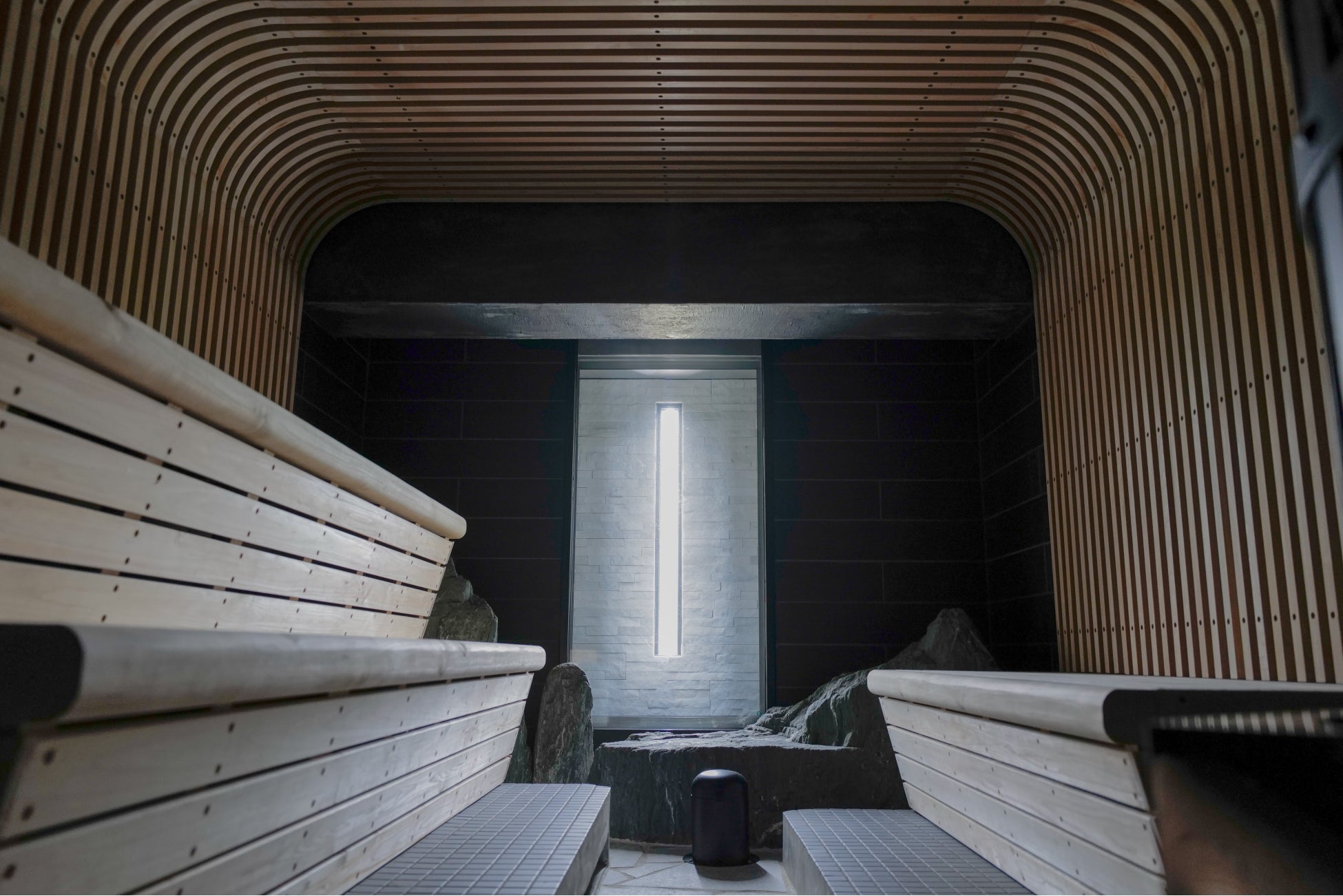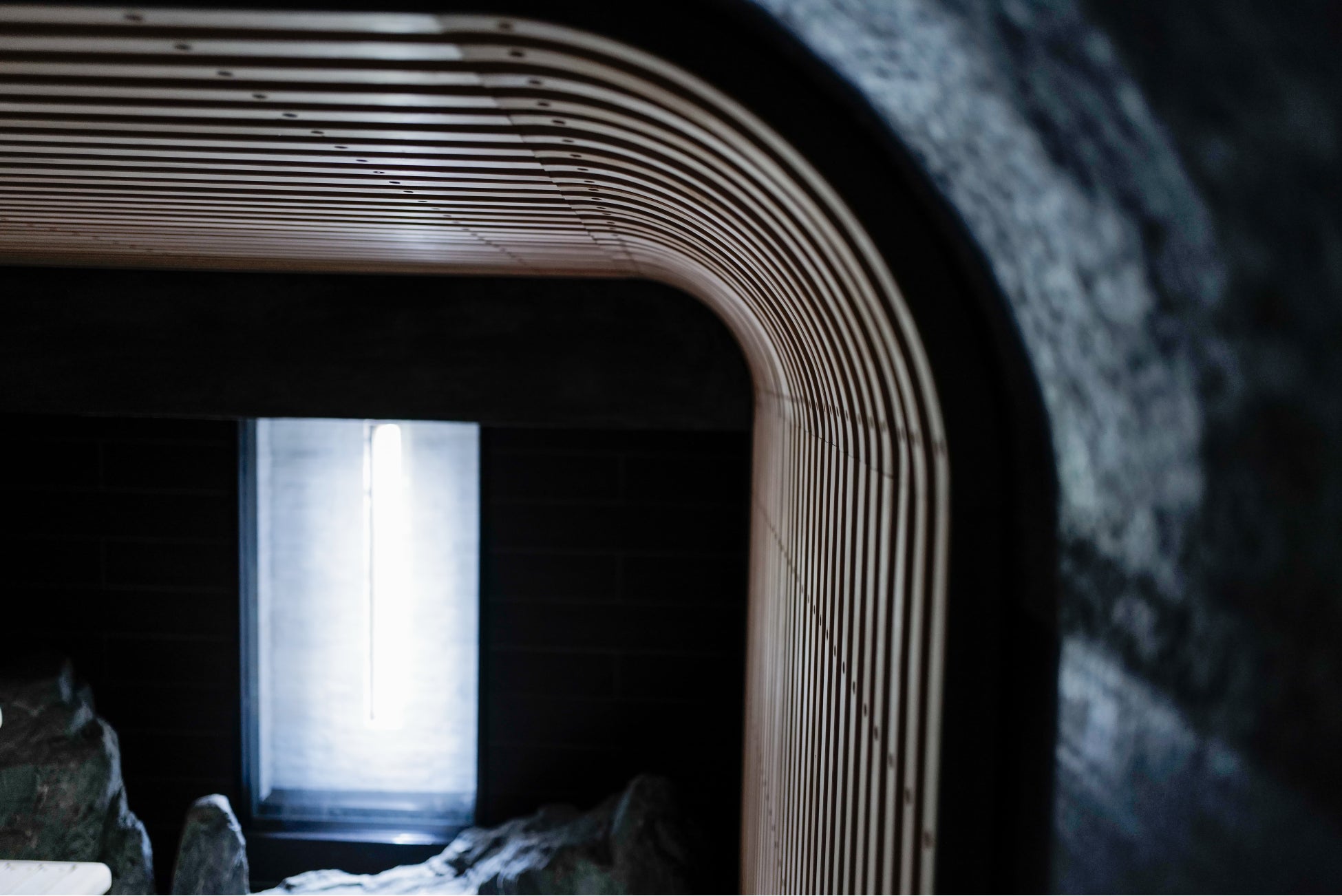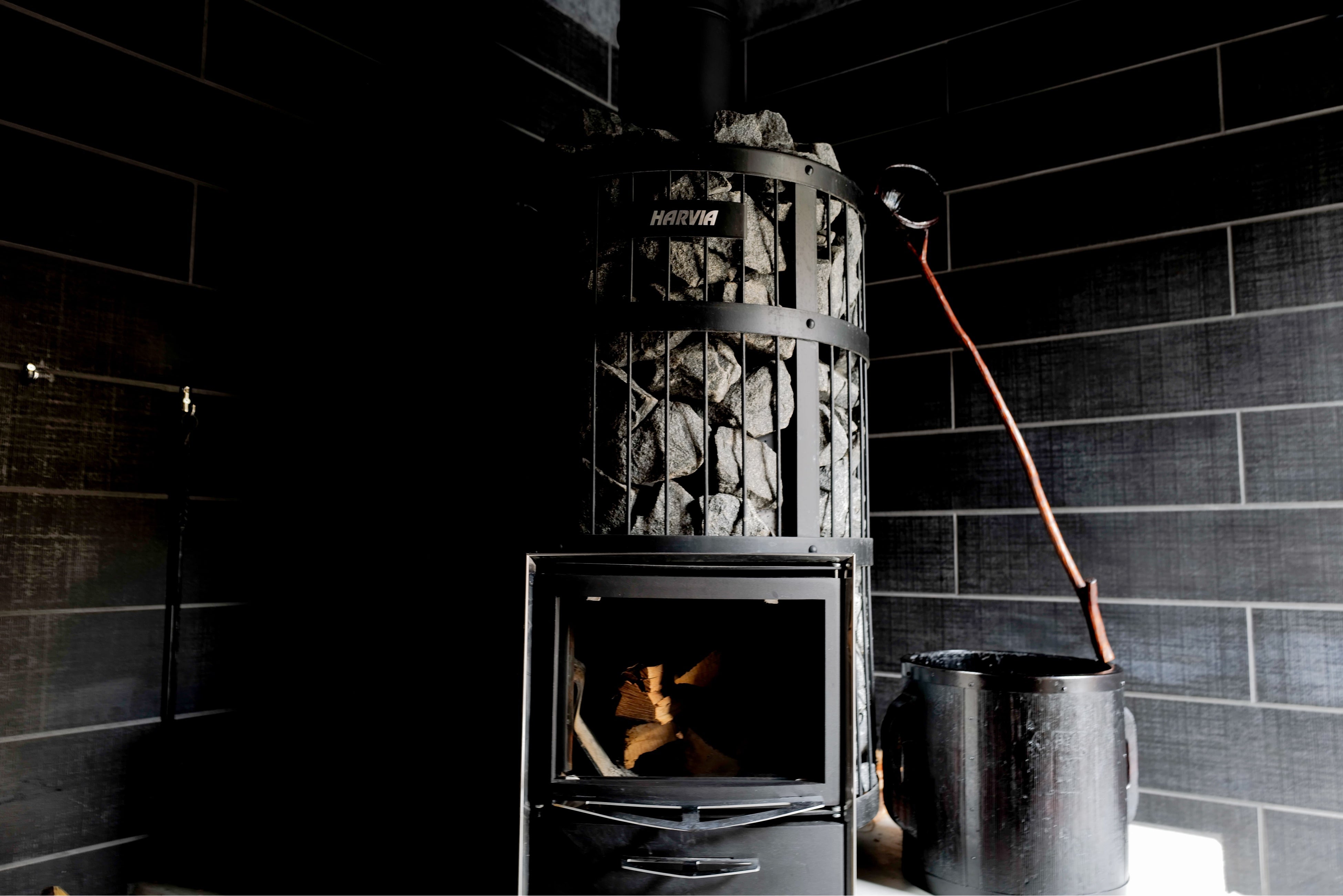 HARVIA社製のサウナストーブLEGEND300を設置し、天井は蒸気がまわりこみやすいアール設計。蒸気の対流をダイレクトに感じる天井高1.1mの座面に腰を掛け、壁からの輻射熱と薪き火のやわらかい熱があなたを包み込みます。