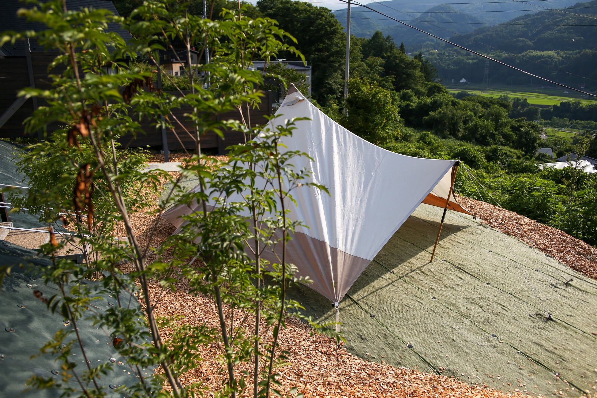 約80平米のウッドデッキにコットン生地のタープを展開。