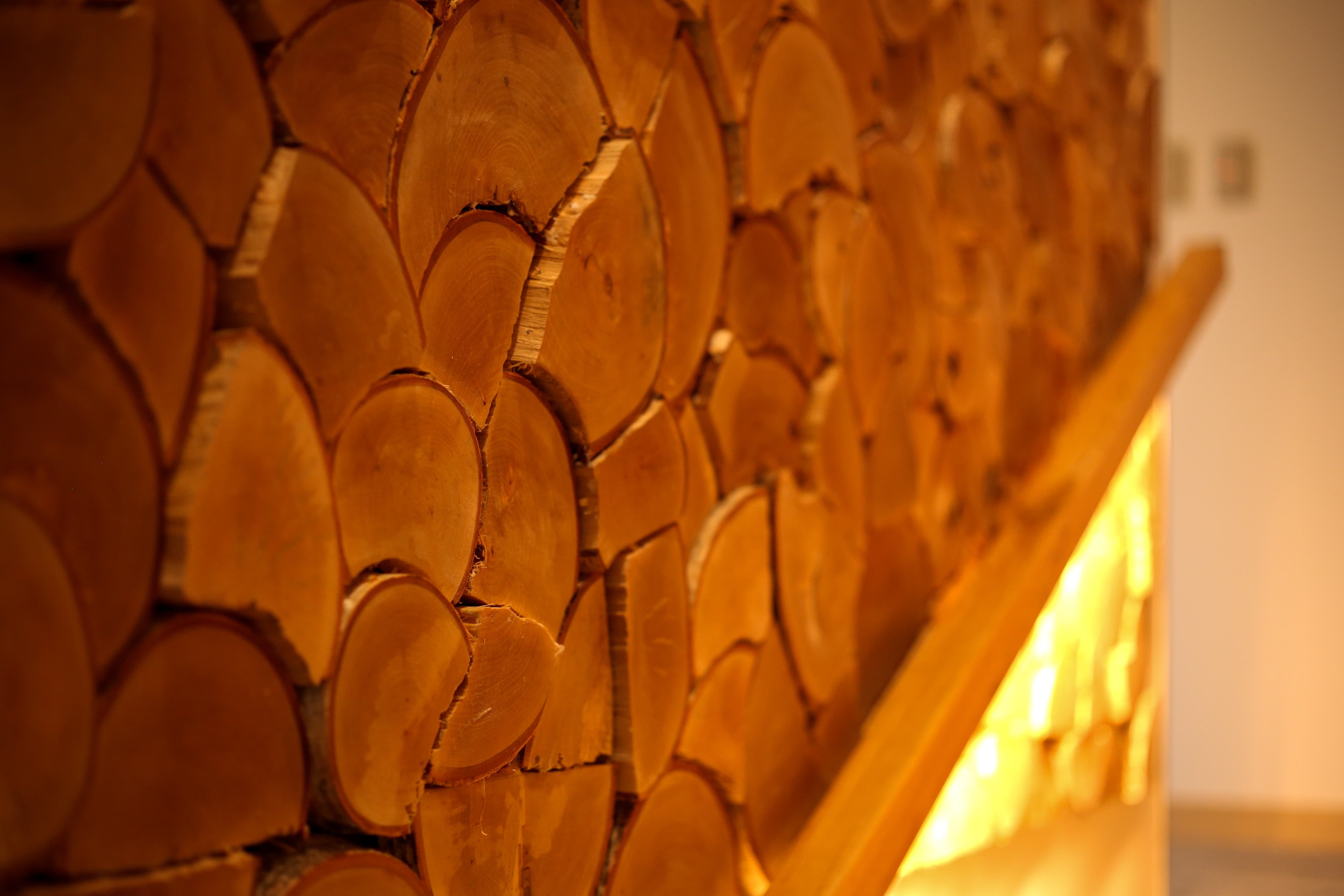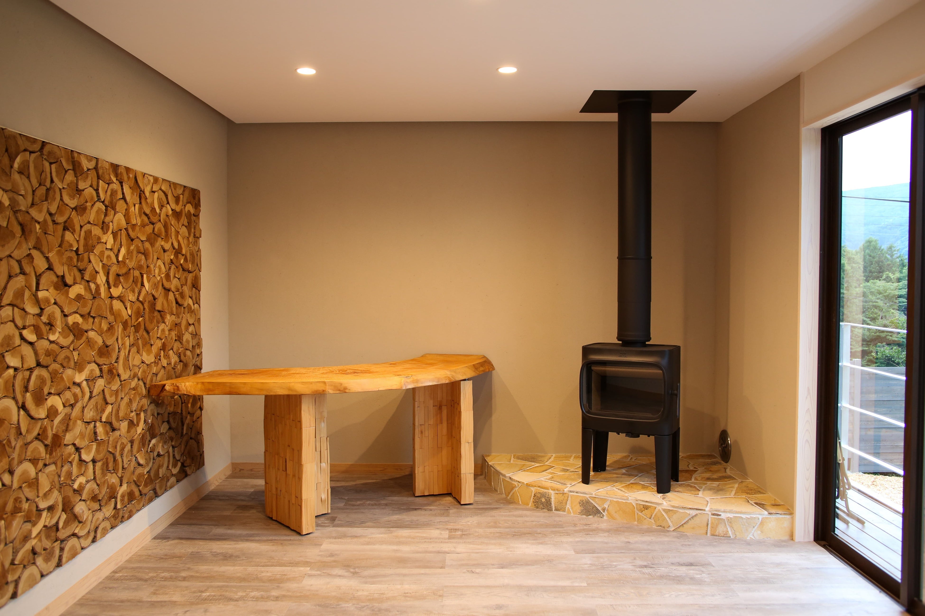 地元広葉樹の壁と薪ストーブがあるリビングで、サウナ後の休憩やミーティング・デスクワークなどのちょっとしたお仕事もできます。