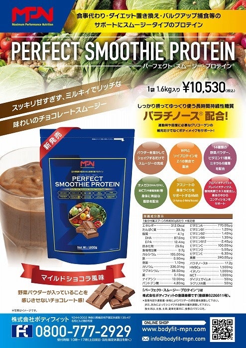 オリジナルスポーツサプリメント「Maximum Performance Nutrition(通称:MPN)」の開発・販売をする株式会社ボディフィットは、新たな商品ラインナップとして、パーフェクト・スムージー・プロテイン(マイルドショコラ風味)を2023/10/13より発売いたします。