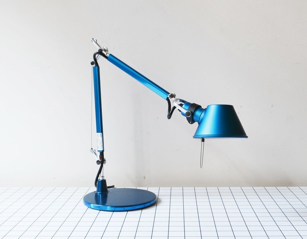 建築家・Michele De Lucchi(ミケーレ・デ・ルッキ)の代表作であるデスクランプ「Tolomeo(トロメオ)/Artemide(アルテミデ)」。テレビや映画のインテリアでも多く起用されるデスクランプの名作です。「ダークブルー」は数量限定で発売されたカラーで、メーカー在庫限りで販売終了となる貴重な仕様。トロメオは1989年にコンパッソ・ドーロを受賞しています。