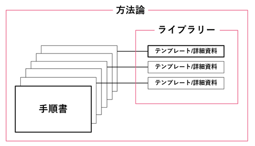 これまでの多くのDX推進サービスで培ってきた経験をもとに、DX推進における各手順を方法論としてまとめ上げました。さらに各々の手順における様々な知見やノウハウをライブラリとして整理しております(図2、図3)。