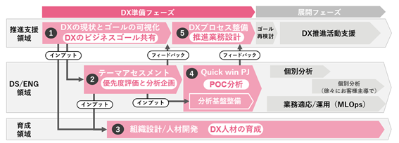 TDSE DX推進方法論は「①DXの現状とゴールの可視化」「②テーマアセスメント」「③組織設計/人材開発」「④Quick win PJ」「⑤DXプロセス整備」の5つの観点からお客様のDX推進を統合的にご支援することが可能です。今後は本方法論を活用することでより効果的なDX推進をサポートして参ります。