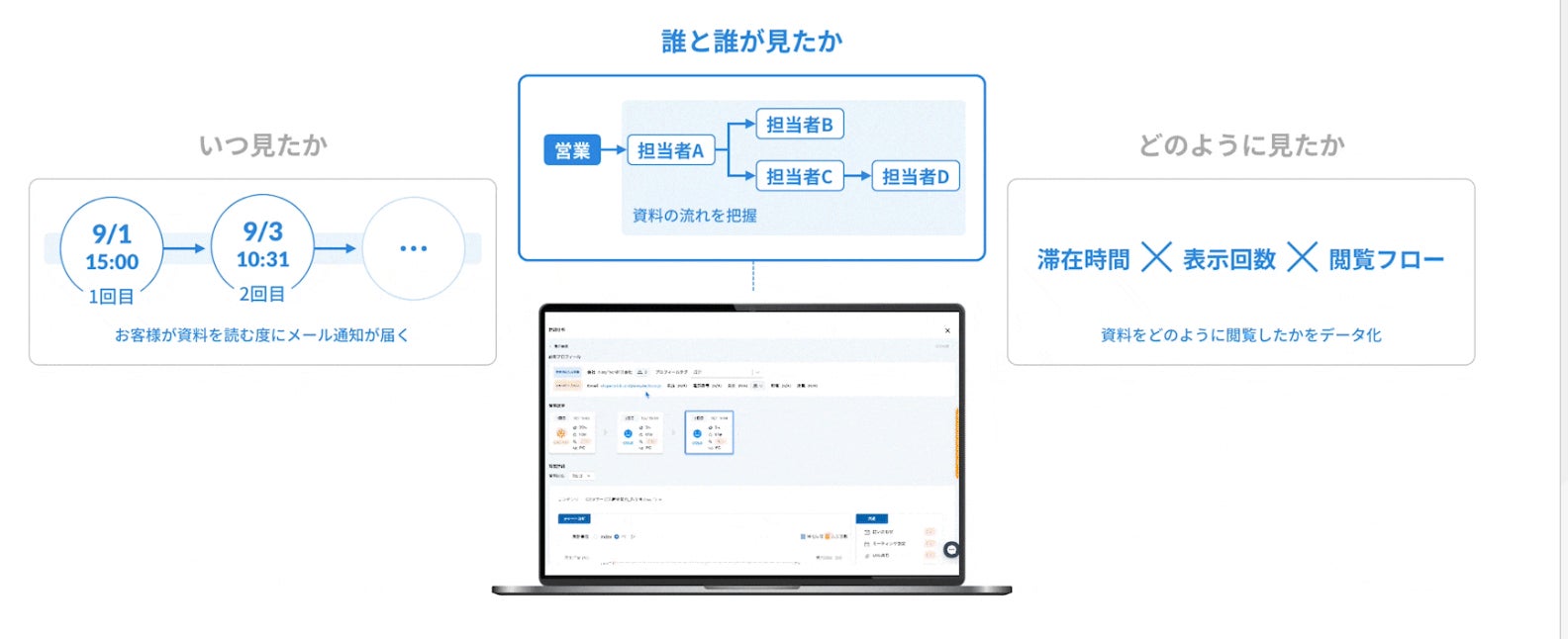 GRiXとは、営業資料を起点にお客様の興味関心を可視化して、質の高い追客を支援するツールです。従来取得が難しかった、資料上の詳細行動(どのページを誰と誰がどれくらい見ているか)を可視化して、「資料送付後の顧客行動の実態が把握できていない」という営業担当者の悩みを解決します。導入効果として、インサイドセールスの着電率が2倍、商談化率1.5倍、案件化率3倍になった実績もあり、小規模事業者〜上場企業まで様々なお客様にご利用いただいております。