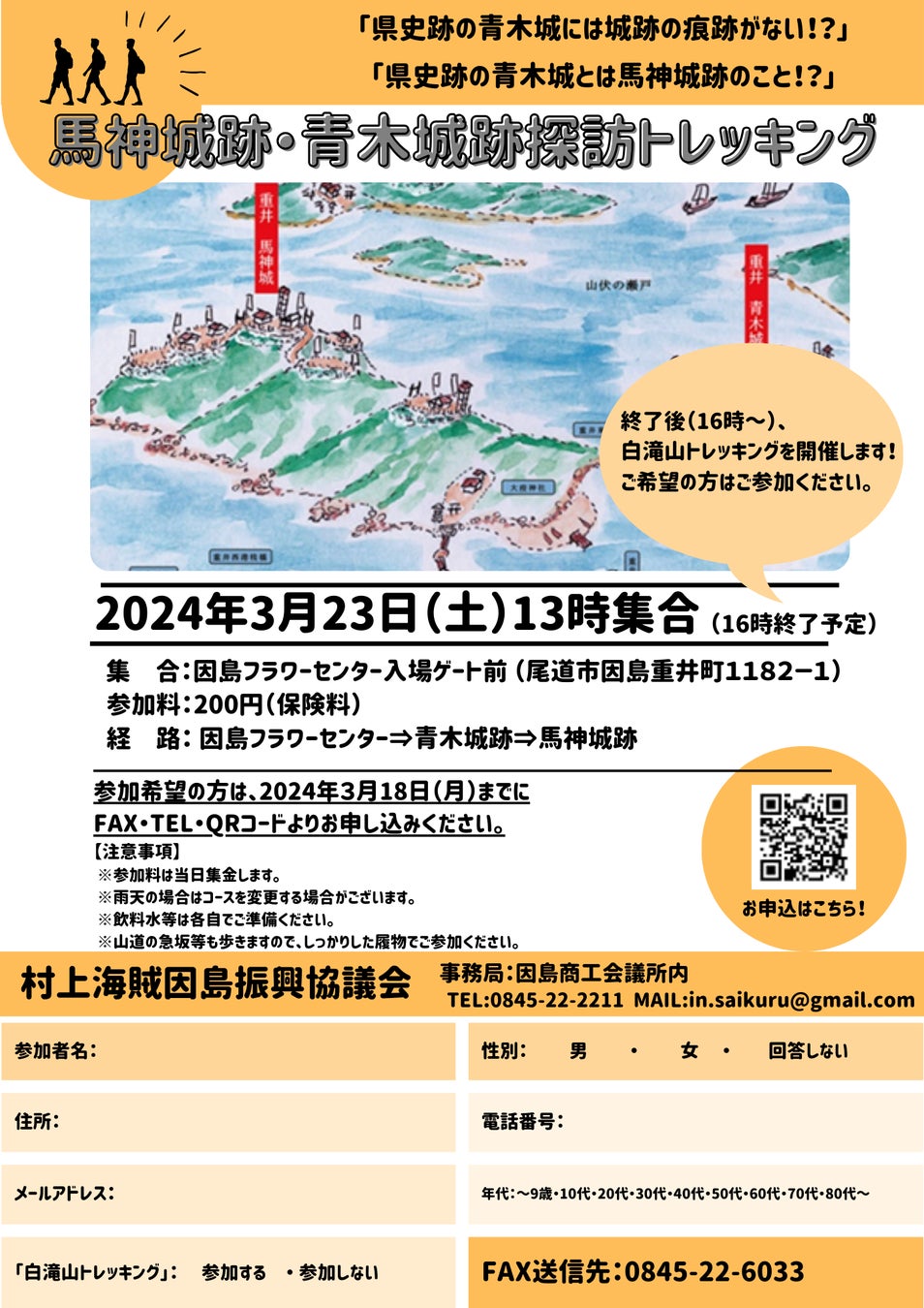 トレッキングのコースは因島フラワーセンターを出発し、青木城跡、馬神城跡を巡ります。所要時間は約3時間です。参加費は200円(保険料)です。