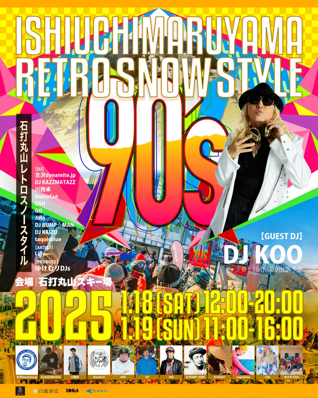2025年1月18日(土)~19日(日)の2日間、石打丸山スキー場(新潟県南魚沼市)にて、90年代の雰囲気を再現した特別イベント 「石打丸山Retro Snow Style」 を開催します。今回で3回目の開催となる本イベントは、ゲレンデ内に3ヶ所のDJブースを設置し、スキーやスノーボードを楽しみながらフェスに参加できる唯一無二のレトロミュージックフェスです。1月19日(日)にはスペシャルゲストとしてDJ KOOの出演も決定!さらに、ワールドワイドに活躍するインフルエンサーLilly、スノーボード界に旋風を巻き起こしているうどん娘も来場。白瀧酒造の協賛によるふるまい酒もおこないます。