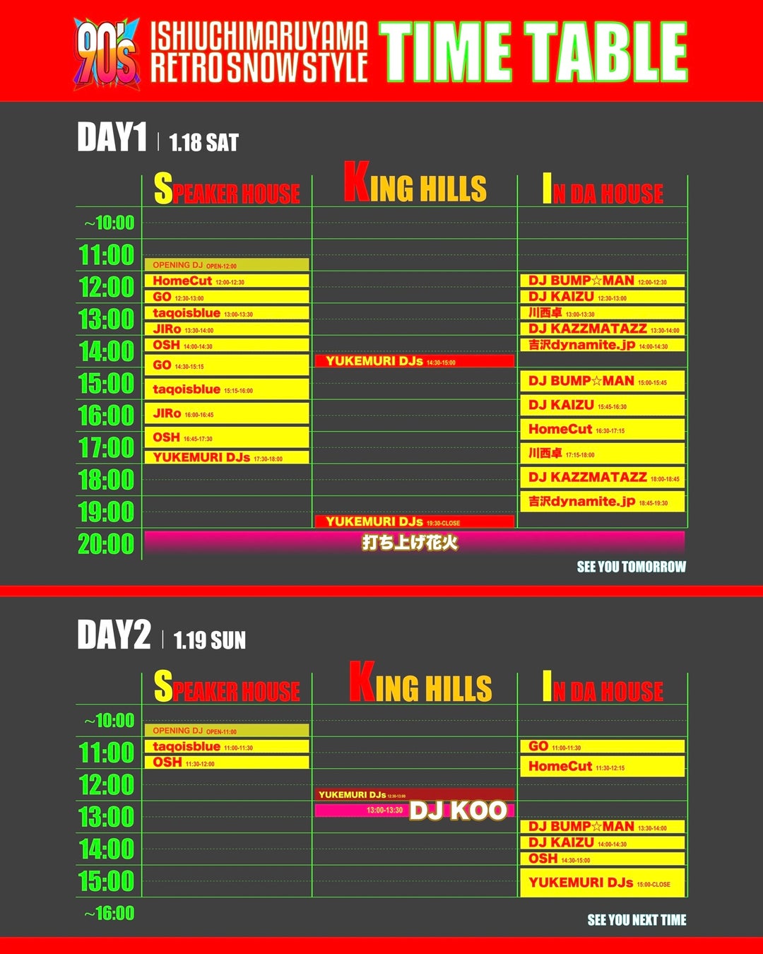DJ:DJ KOO、HomeCut、OSH、GO、DJ KAIZU、DJ BUMP☆MAN、taqoisblue、ゆけむりDJs
