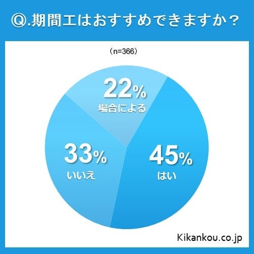 期間工という働き方を人におすすめできるか尋ねたところ、「期間工はおすすめできる」と答えた方が45%、「期間工はおすすめできない」と答えた方が33%、「時と場合による」と答えた方が22%でした。
