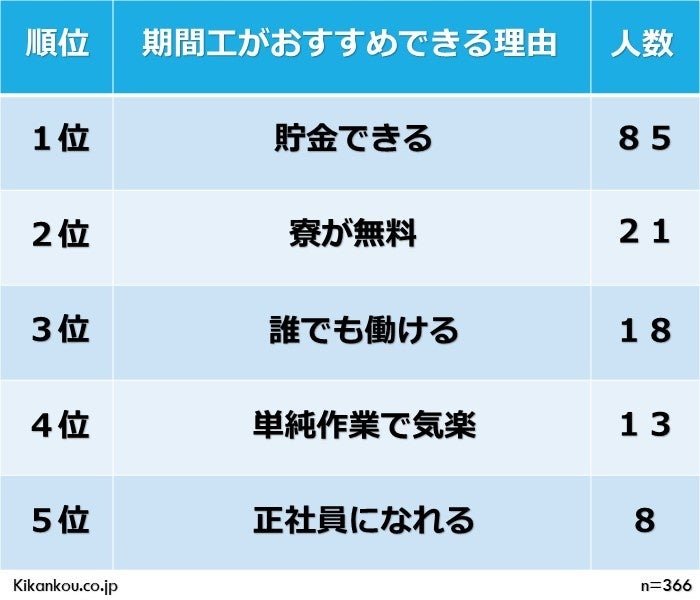 2位が「寮が無料」、3位が「誰でも働ける」、4位が「単純作業で気楽」、5位が「正社員になれる」という結果になりました。その他にも「起業するならおすすめ」「投資資金を稼ぐならおすすめ」など金銭面での回答が多かったです。