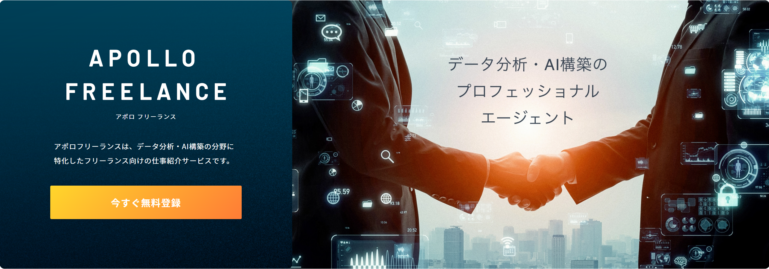 『アポロ フリーランス』とは現職でデータサイエンティストとして活躍している方向けに、副業としてスキルを発揮していただき、データ分析・活用に取り組む企業へ即戦力人材としての提案をするサービスです。