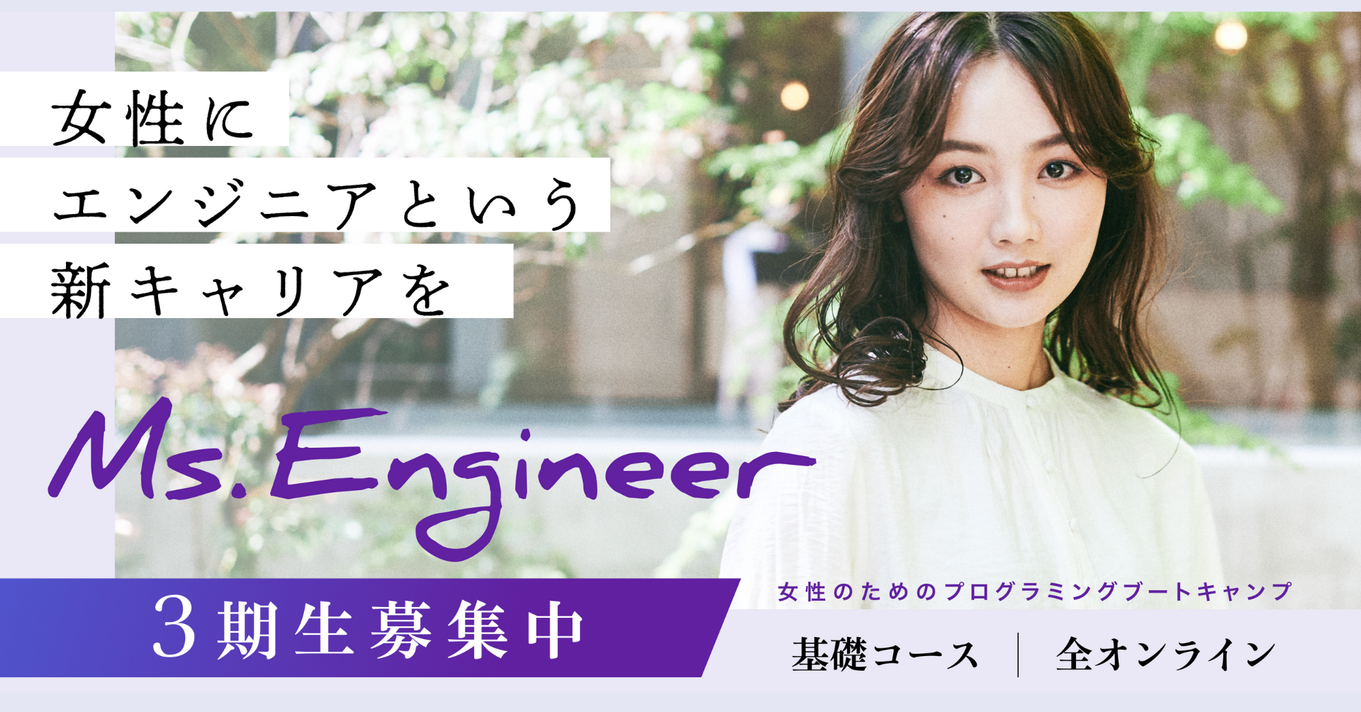 Ms.Engineerでは6月20日開講の3期生を募集しています。仕事や学業を続けながらプログラミングの基礎が学べる5週間の初心者コースを、女性のみのクラスで受けることができます。授業は全てオンライン、リアルタイム開催となり日本全国どこからでも、ご受講いただけます。