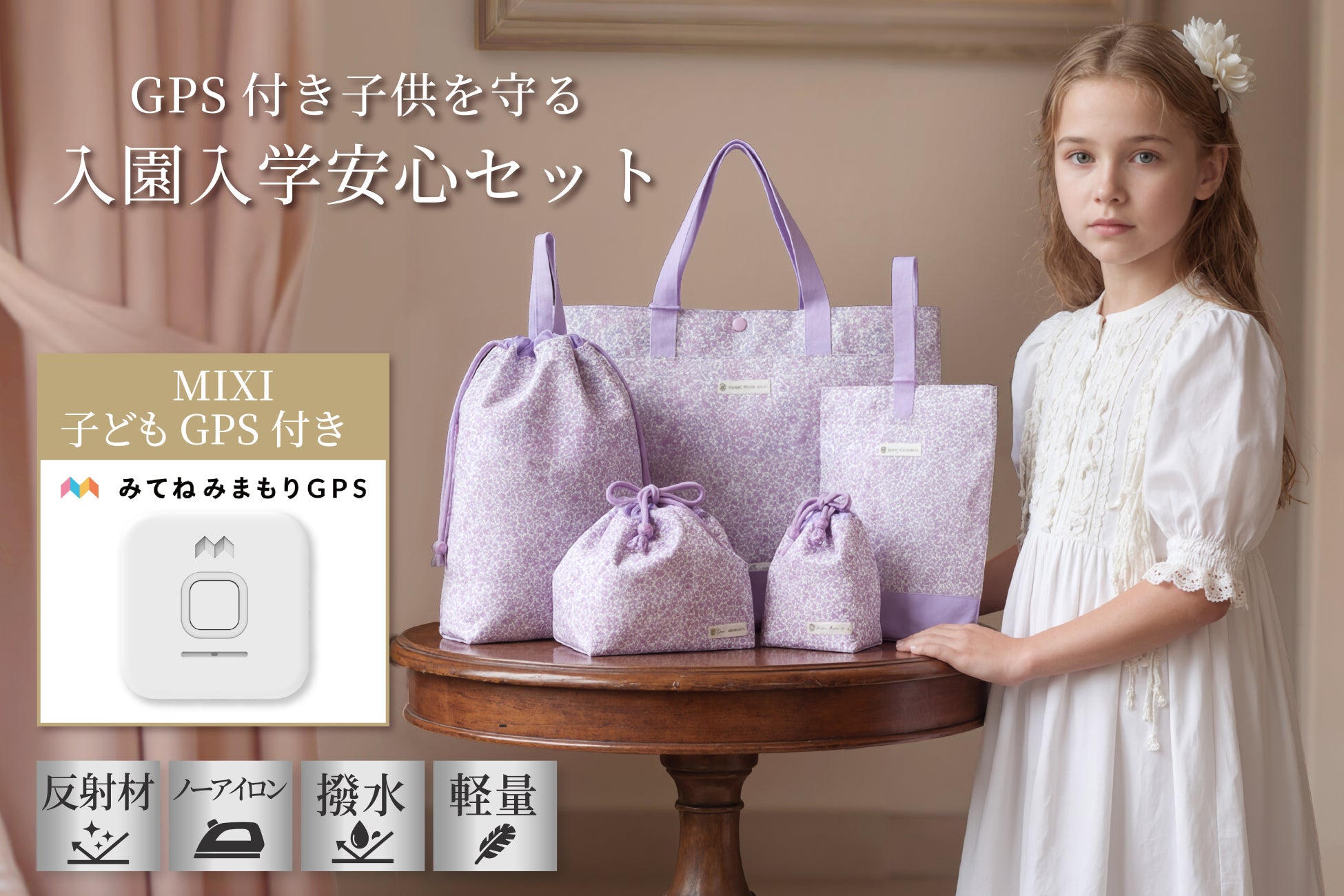 子どもの安全対策に新提案。MIXI社GPS端末と入園入学グッズを一体化した「GPS付き子供を守る入園入学安心セット」を発売