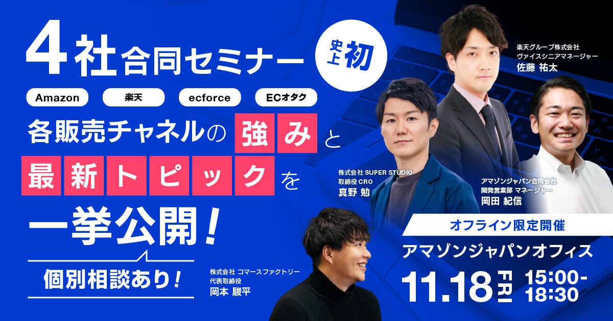 そこで、日本で多くのお客様に利用されているECサイトであるAmazonと楽天市場、そして自社ECの領域でECプラットフォーム「ecforce」の提供だけでなく自らも製品を開発しD2C事業を行なっているSUPER STUDIO社をお呼びし、セミナー&パネルディスカッションを行います。