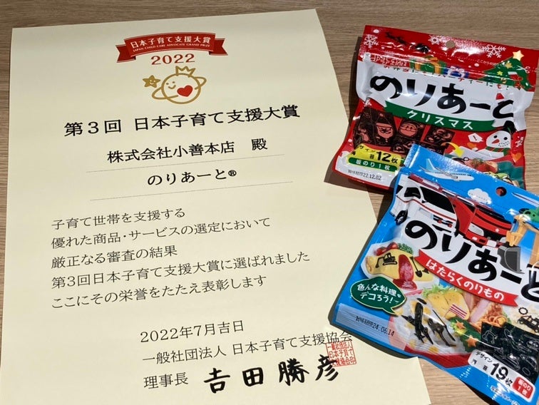 株式会社小善本店(本社:東京都台東区、代表:小林善昭)の、『のりあーと®』商品シリーズは、「第3回日本子育て支援大賞2022」(主催:一般社団法人 日本子育て支援協会)を受賞しました