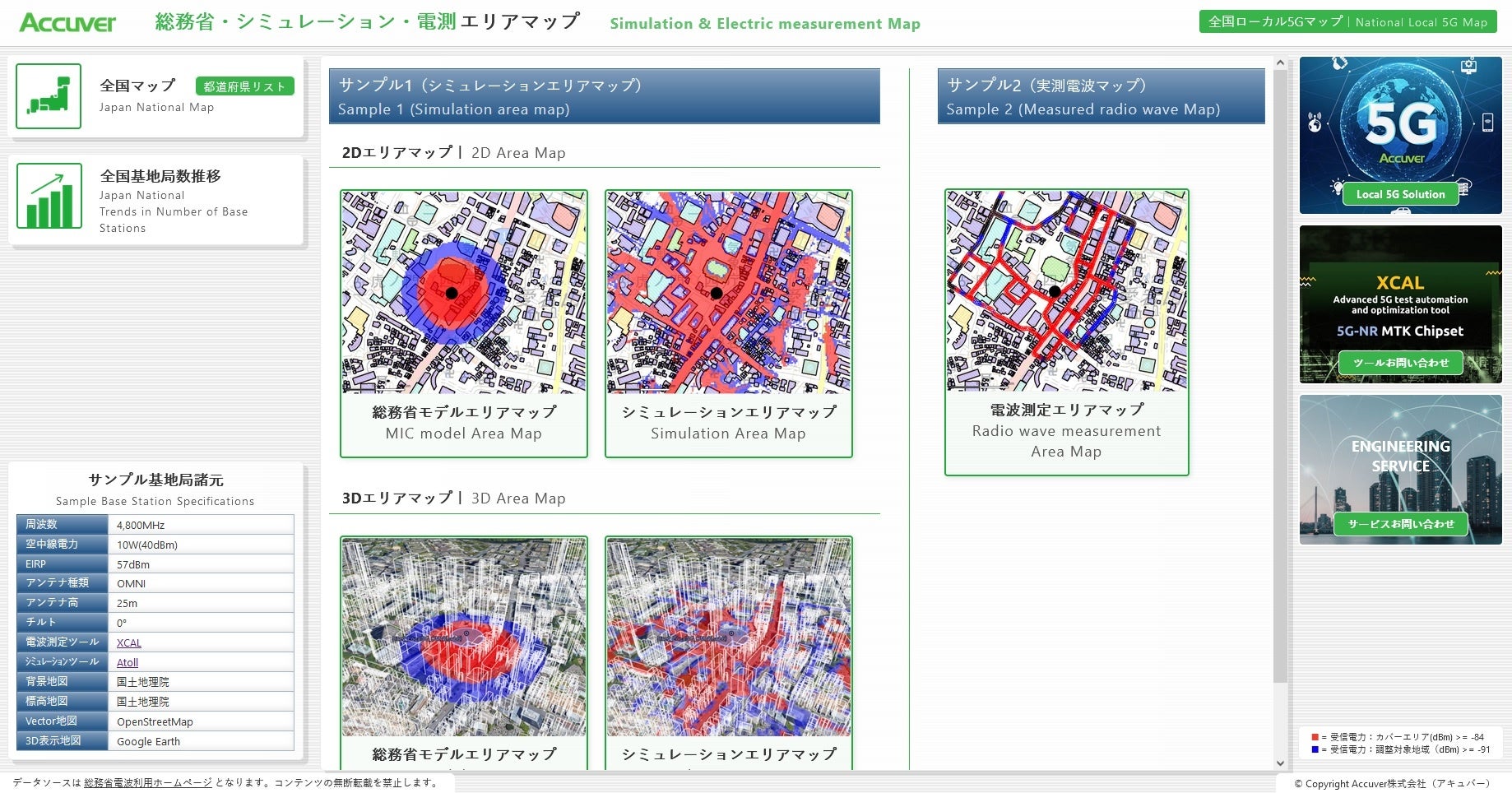 また、Accuver株式会社はローカル5G免許申請やエリア構築に必要な無線シミュレーションツール、電波測定ツールも提供しており、本サイトではシミュレーション・電測マップとしてサンプルエリアマップを公開しています。