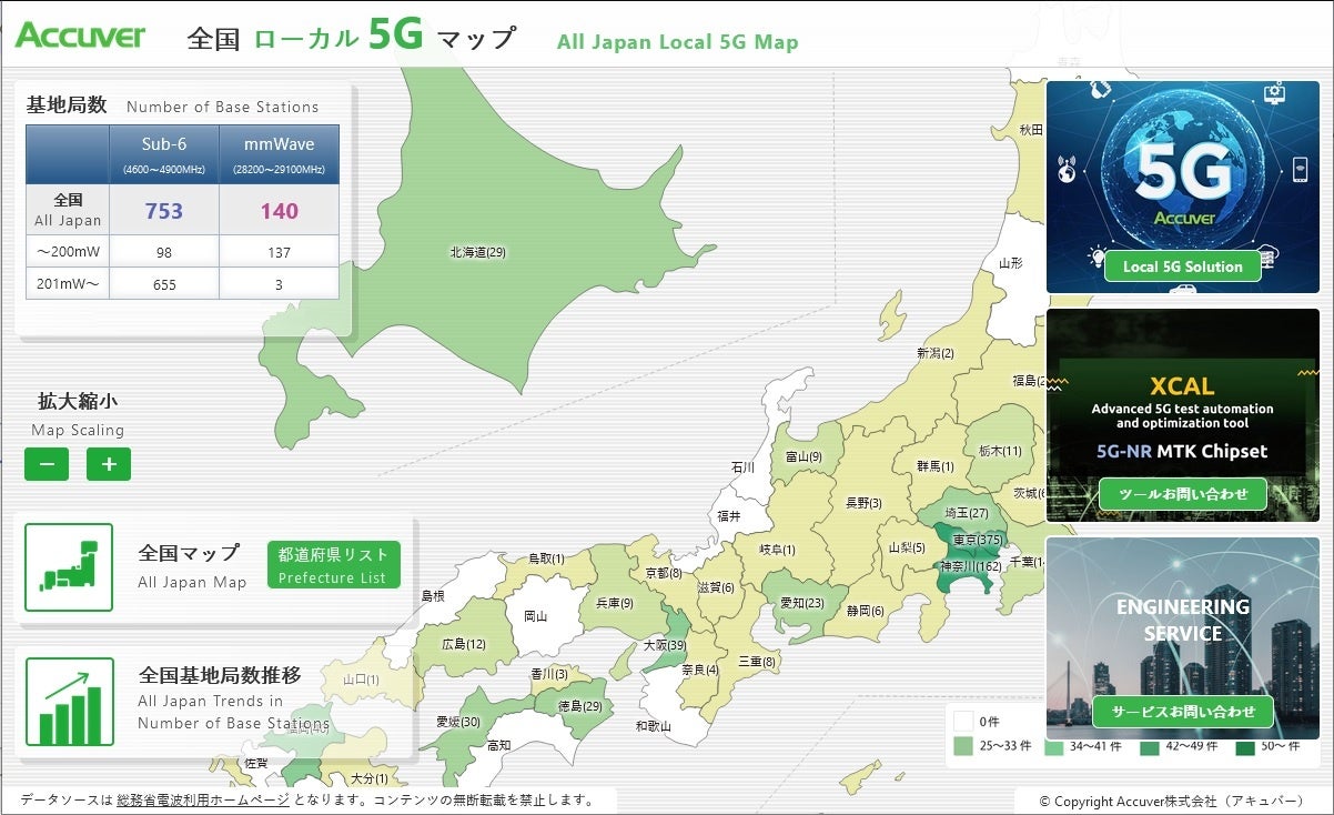 Accuver(アキュバー)株式会社は、総務省のローカル5G無線局免許付与状況をまとめたローカル5Gマップをスマートフォン対応、英語併記対応して公開しました。