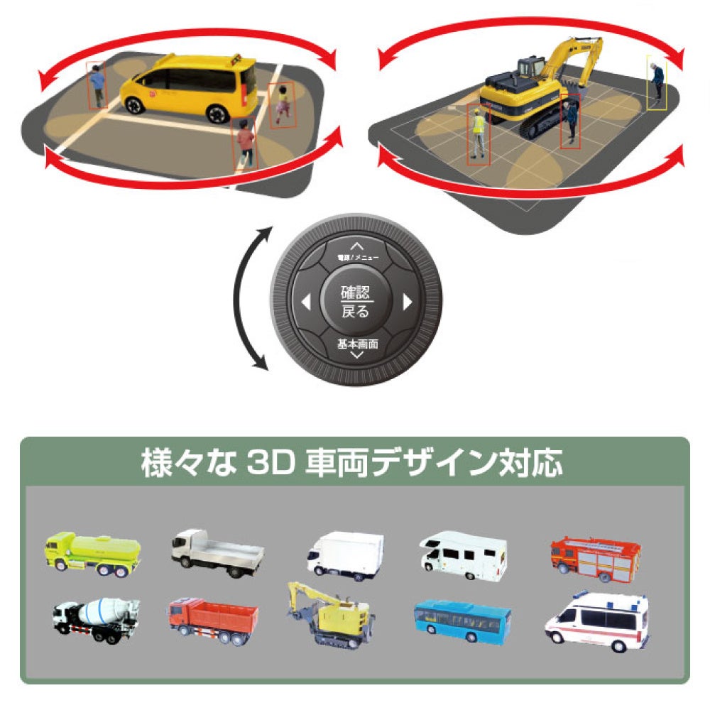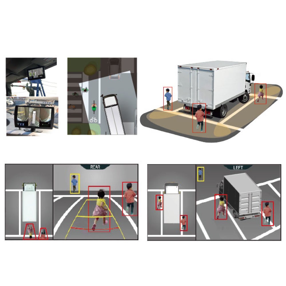 車輌に取り付けた4つの高性能カメラで、車輌を上から見下ろしている様な映像を作りだし、車輌の周囲360度をひと目で確認できます。さらに独自のAIテクノロジーでカメラが人物と車両を認識し危険をリアルタイムでアラームします。
