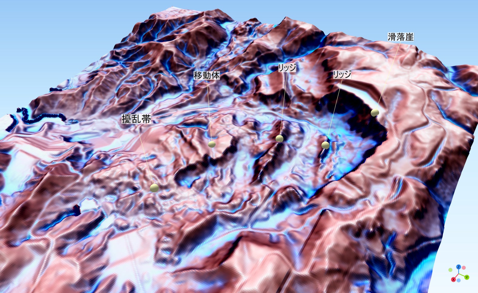 これにより、がけ崩れのあとや地すべり特有の地形、崩壊した土砂がたまっている箇所、水が流れた痕跡などが図面上で判読しやすくなり、災害リスク箇所の抽出や評価の精度が向上するほか、地形学的な研究にもご利用いただけます。