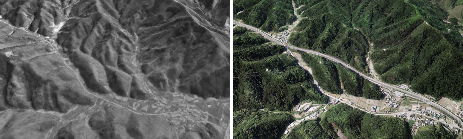 右:同じ位置の現在の地形(いずれも国土地理院の空中写真を使用)