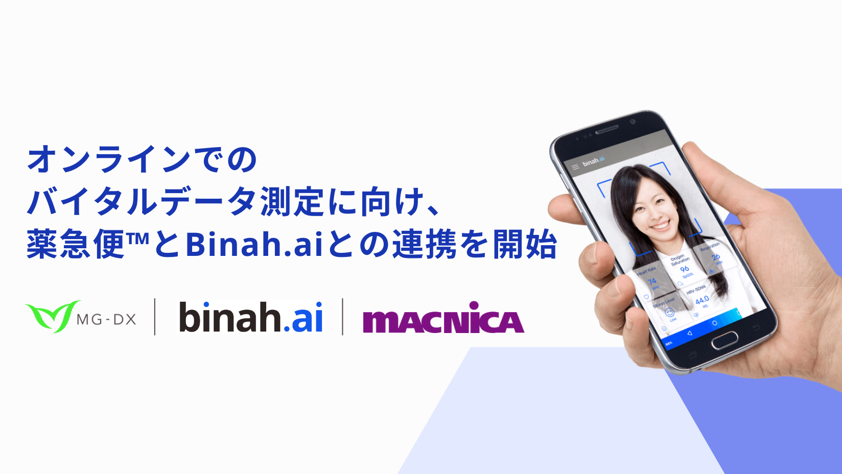 医療機関のDXを推進する株式会社MG-DX (本社:東京都渋谷区、代表取締役:堂前 紀郎、以下「当社」)は、スマートフォンのカメラを用いた非接触型のバイタルデータ測定ソリューションを開発・提供するBinah.ai(本社:イスラエル、CEO/CTO:David Maman、以下「ビナー」)の日本国内正規代理店である株式会社マクニカ(本社:神奈川県横浜市、代表取締役社長:原 一将、以下「マクニカ」)の協力のもと、「薬急便™」の利用者に向けた新たなサービス開発を開始することをお知らせいたします。