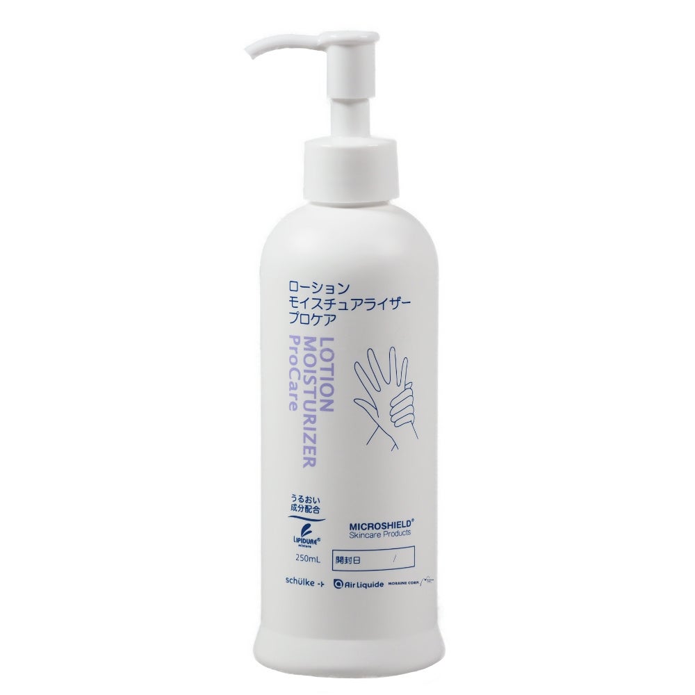 ローションモイスチュアライザー プロケアは、3種類の保湿成分を配合し、使用者の皮膚をすこやかに保つことで手肌の荒れを防ぐハンドローションです。