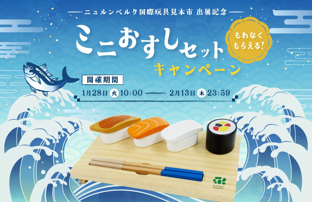 木製玩具ブランドの「ウッディプッディ」を運営する株式会社ウッディプッディ(本社:兵庫県神戸市、代表取締役社長:中川 繁夫)は、2025年1月28日(火)よりドイツで開催されるニュルンベルク国際玩具見本市への初出展を記念して、同日よりウッディプッディ公式オンラインショップにてミニおすしセットがもれなくもらえるキャンペーンを実施します。
