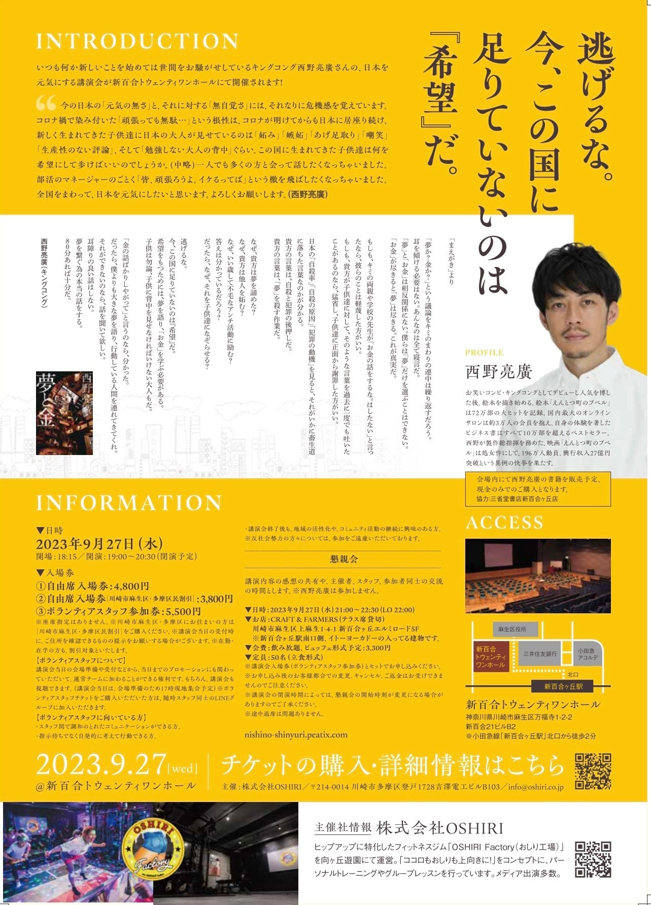 いつも何か新しいことを始めては世間をお騒がせしているキングコング西野亮廣さんの、日本を元気にする講演会を新百合トウェンティワンホールにて開催します!