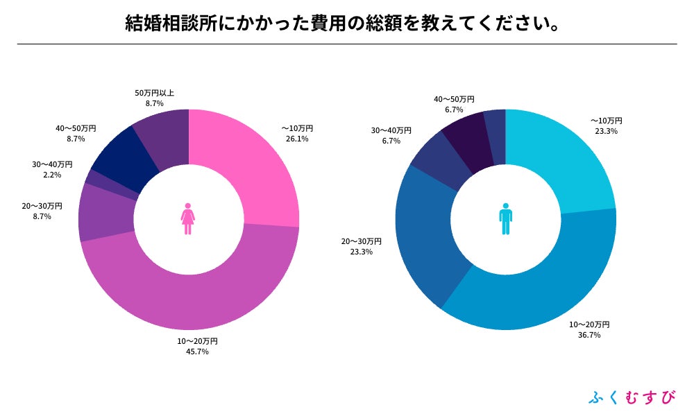 ・結婚相談所にかかった費用について、女性は10万〜20万が最も多く、男性は20万円以上が最も多い結果となりました。