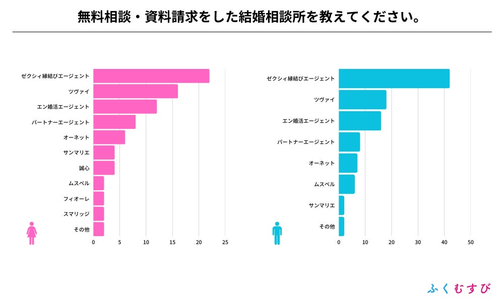 ・無料相談や資料請求をした結婚相談所は、男女ともに1位ゼクシィ縁結びエージェント、2位ツヴァイ、3位エン婚活エージェントとなりました。