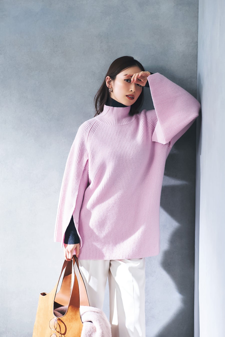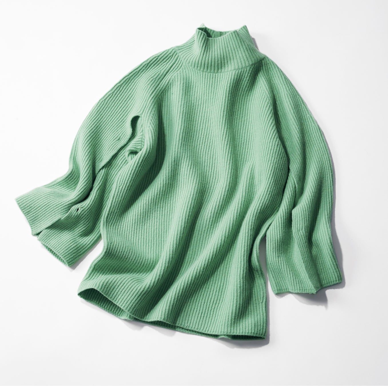 高さはしっかりあるけれど、さりげなく首が除くネック丈に。