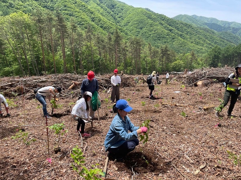 植栽地は甲府盆地の東寄りに位置する「笛吹芦川」。芦川源流域のカラマツの伐採跡地に 地元植生の広葉樹を植え、100年先まで存続する水源林を育てます。人びとを災害から守ると同時に、森で育まれた清らかな水が、そこに生息する多くの生き物たちを守り、いつまでも野鳥のさえずりが響き続ける森をつくることを目指します。