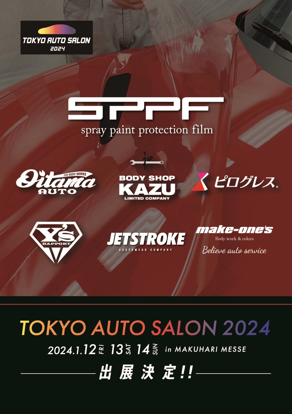 有限会社ジェットストロークSPPF/RubberDip事業部は、1月12日(金)から14日(日)まで開催される東京オートサロン2024に過去最大のブースにて出展します。期間中は当社で製造・販売している、塗って剥がせる透明塗料「SPPF」を施工した車両を展示。また、実際に塗装を行った職人さんや、海外の自動車鈑金塗装会社も交えトークショーを開催します。