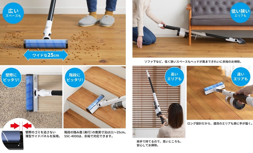 その掃除機商品群の第二弾として、フローリングに最適な自走式ソフトローラーパワーブラシを搭載した『充電式スリムスティッククリーナー(SSC-4000WH)』を、2023年5月15日に発売します。