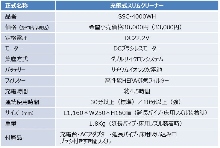 【充電式スリムスティッククリーナークリーナー(SSC-4000WH) 製品情報】