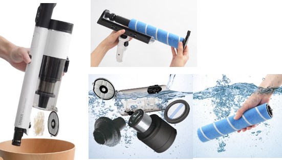 また、ダブルサイクロンシステムに加え、高性能HEPA排気フィルターを搭載。ハウスダストやPM2.5といった微細なほこりも逃しません。ヘッドもダストケースも水洗いできるので衛生的。パーツが簡単に取り外し可能で、組み立てもラクラクなので、長く普段使いしたい方にはうれしい機能です。