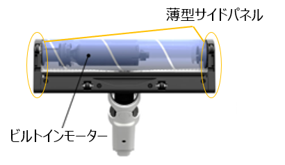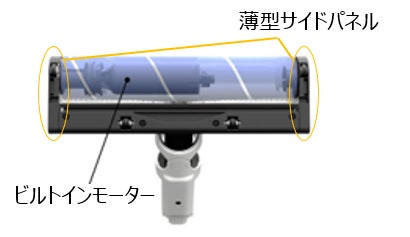 本製品は、ヘッド部分にビルトインモーターを採用。自走式なので、力を入れずに動かせて、パワフルな吸引力を発揮します。ヘッドの幅は25cmのワイド設計。フローリングに適したソフトローラーブラシで、居住空間の多くを占めるフローリングや畳におすすめです。ヘッドの両サイドは薄型パネルを採用。壁際のゴミもしっかりキャッチします。