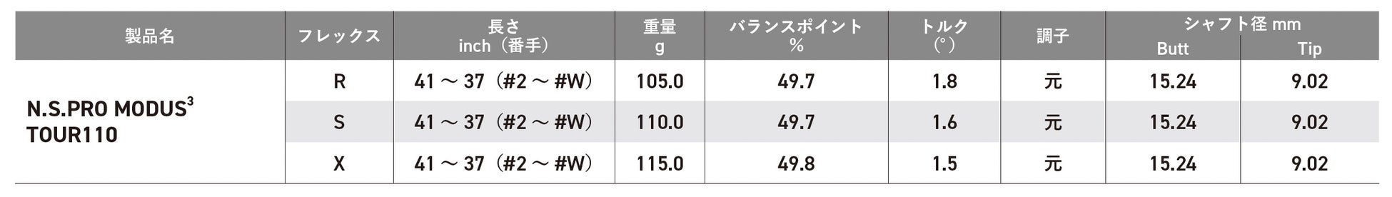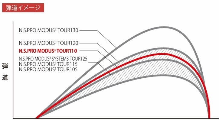 今回のプロジェクトは、ツアーで展開しているプロトタイプを整理し、求められる弾道や好まれる重量帯に対するヒアリングを繰り返し、より速く・より強く・より操作性に優れたシャフトのニーズを明らかにしました。その結果、N.S.PRO MODUS³ブランド第2章の新たな幕開けにふさわしいMODUS³シリーズ6モデル目となるN.S.PRO MODUS³ TOUR110が開発されました。(※2024年当社調べ)